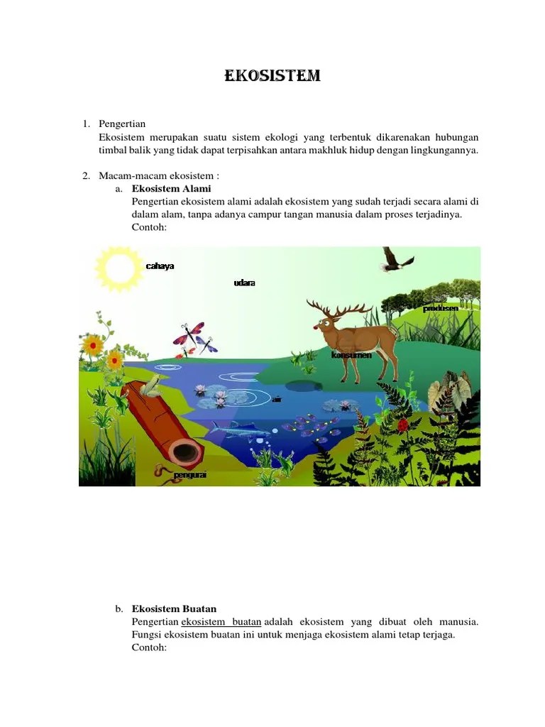 Contoh lingkungan alam yang sebenarnya buatan namun terkadang jarang disadari yaitu waduk. Ekosistem dan organisme di dalamnya secara alami memiliki kemampuan untuk. Suaka marga satwa dibuat oleh manusia langsung di alam. Antara lain berikut ini contoh ekosistem alami : Pelajari materi ekosistem dari pengertian ekosistem, komponen ekosistem, macam ekosistem, sampai dengan contoh ekosistem laut, sawah, hutan, darat, sungai, .